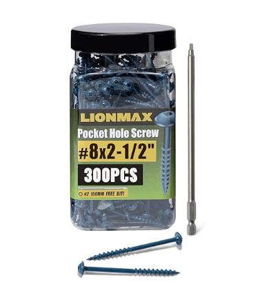 LIONMAX Pocket Hole Screws 2-1/2 Inch, 300 PCS Exterior Pocket Screw #8 x 2-1/2", Coarse Thread, Square Drive, Washer Head, Blue Coated Weather Resistant, 150MM Drive Bit Included